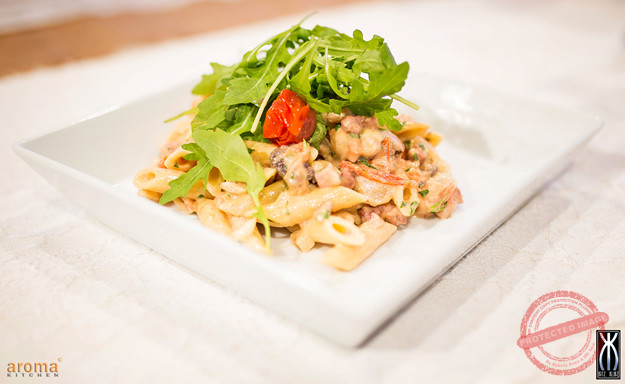 On a preheated pan seal from both sides the roughly cut liver and pancetta with very little oil. Lower the heat and add the chopped garlic, onion and butter to brown slowly. Once the vegetables are browned add the quartered cherry tomatoes and sauté until softened, add cooked pasta, parsley than toss and add the cream, toss constantly well and remove from heat. Serve immediately.