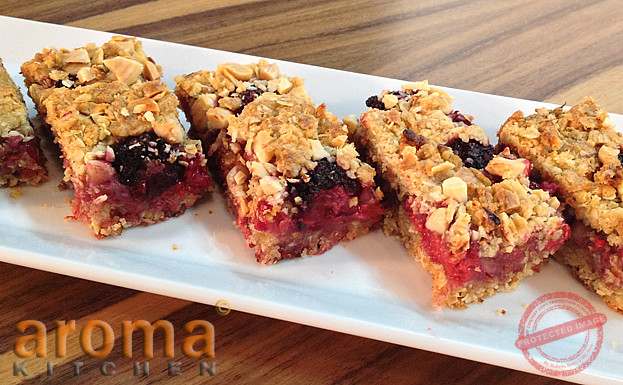 Grease and line a 23cm square cake tin with non-stick paper. Place the ground almonds, flour, oats and butter into a mixing bowl and use your fingers to work the mixture together to make coarse crumbs. Mix in the sugar, lemon and lime zest and three quarters of the pine nuts. Place 2/3 of the mixture into the prepared cake tin and even out well. Carefully scatter the raspberries on top before sprinkling over the remaining oat mixture. Scatter over the remaining pine nut and press everything down lightly. Bake in the oven at 170`c for 35-40 minutes until pale golden on top. Cut into 12 bars with a sharp knife while still warm, then leave to cool completely in the tin before serving.