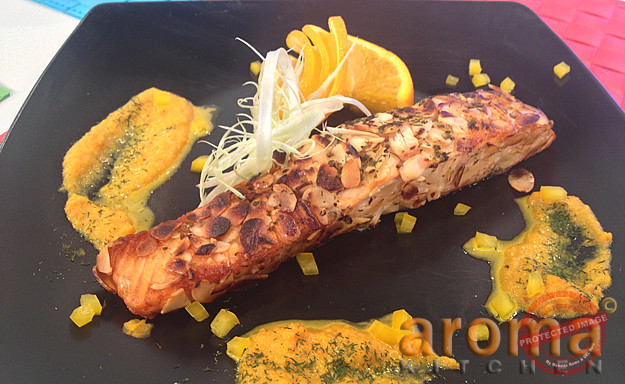 For the puree, grate the rind of the orange and squeeze orange juice. Add all ingredients in a sauce pot and cook until carrots are tender. Blend and put aside. Rub olive oil on salmon, the roll in almond flakes and green pepper corns. Heat pan and seal the salmon. Put in an oven proof dish and bake for approximately 12 minutes in a pre heated oven. Serve together with puree and sprinkle some dill.