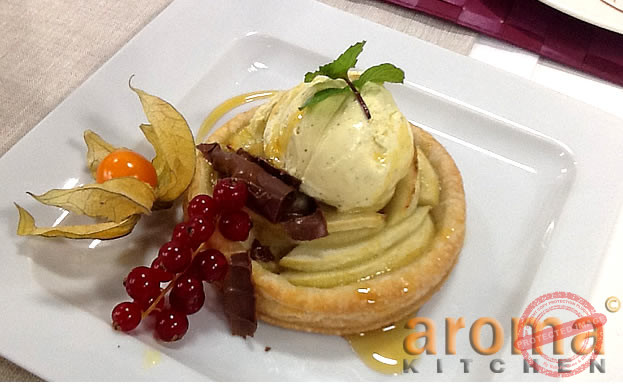 Roll the puff pastry until 2mm thick. Cut 4 round circles about 13cm and place on a baking sheet. Make a score around the edge to form a 1cm border. Prick the centres with a fork and chill for 30 minutes. Peel, core and slice the apples. Arrange on the puff pastry circles and sprinkle with sugar. Put some butter on top and bake in preheated oven 220⁰c until the pastry and apples are golden. Serve with a scoop of vanilla ice cream, drizzle of maple syrup and garnish with some fruit.