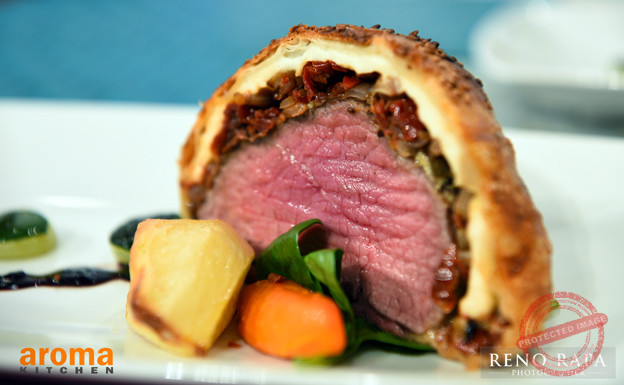 Artichoke and goat cheese pastry wrapped fillet of beef