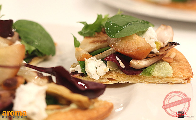 Artichoke pizzette with goats` cheese, poached pears and pine nuts