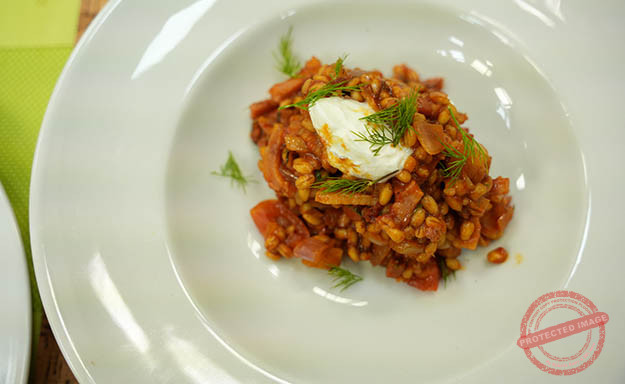 Once liquid is almost all absorbed, add the tomatoes, dill and adjust seasoning. Serve the Mascarpone on top and micro herbs to garnish.