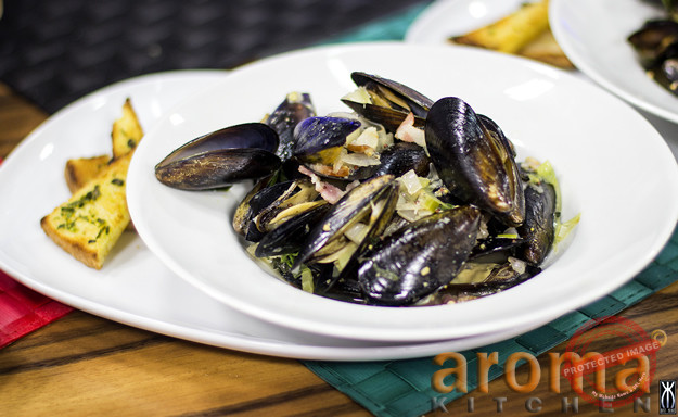 Chop the bacon, onions and spring onion and saute in olive oil withot browning add the beer and bring to the boil simmer, add the mussels and marjoram, cover and simmer for 5 minutes tossing the pan continously. Remove the mussels from the pan and whisk in the mustard, reduce for a few more minutes and pour on the mussles.Chop the mint and mix well with the butter, spread on the toast, grill lightly and serve on the side.