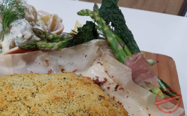To make the bundles, take 3 stems of trimmed asparagus, a pice of curly kale and a sprig of rosemary and hold together. Wrap around 1 piece of Parma ham and place onto a baking tray. Repeat with the remaining ingredients. Drizzle with olive oil, season well with salt and pepper and bake in the oven at 200°c for 5 minutes. Serve immediately.
