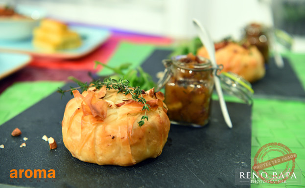 Torti bil-ġobon ‘Camembert’ moħmija bil-ġellewż mixwi u lanġas karamelizzat