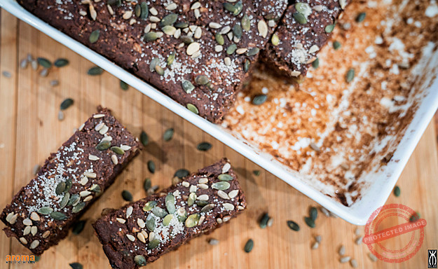 Start this recipe by soaking the oats overnight in a bowl with the milk. The next day, cook together the dates, orange juice and ½ glass water for 3-4 minutes until soft and place into a bowl. Mix in the 2 eggs and mashed bananas. Add in all the remaining ingredients, including the oats soaked in chocolate. Turn into a greased oven dish and spread out evenly. Sprinkle over the extra pumpkin and sunflower seeds and extra brown sugar and bake in the oven at 200`c for about 25-30 minutes.