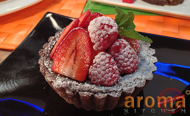 Prepare the chocolate pastry using the rubbing–in method. Chill for 30 minutes to firm up before using to line 4 small 9cm tart tins. Prepare the filling by placing the cream, milk and sugar in a small saucepan and bring almost to the bowl. Quickly remove off the heat and add the alcohol and chocolate to the pan, whisking constantly till it has melted. Next, add the beaten egg and whisk vigorously. Pour the chocolate custard into the prepared tart cases and bake in the oven at 180`c for 20 minutes. Remove from the oven and allow to cool completely before decorating with fresh berries and a dusting of icing sugar
