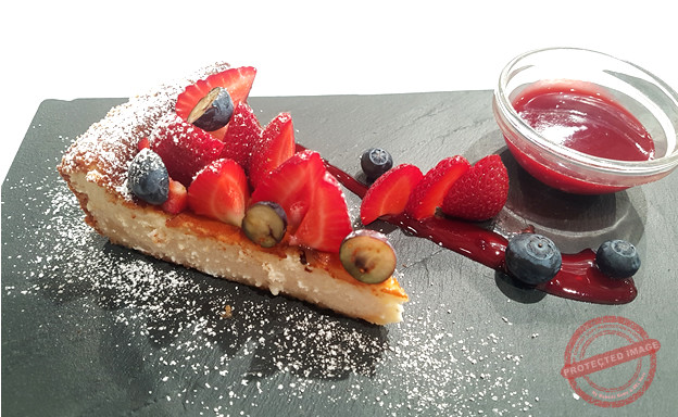Baked lemon cheesecake with raspberry puree and berries