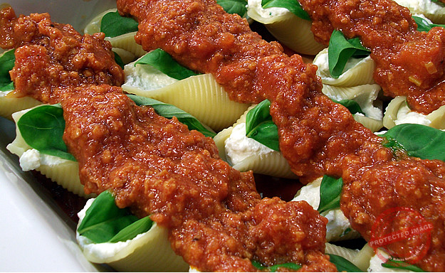 Baked pasta shells with basil, ricotta cheese and tomato salsa