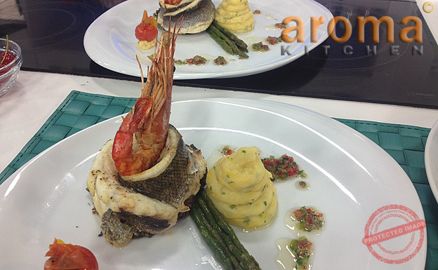 Fillet both fish, marinate with olive oil, cherry tomatoes, seasoning, parsley, wine and some lemon juice. Mean while start boiling the potatoes and the spinach, drain well and mash the potatoes with the Red Leicester cheese. Continue with the spinach by drying it well and seasoning, add the chopped goat cheese. In a pan seal the fish and the king prawns, place them in a dish a continue cooking in the oven for approximately 12 minutes. Fry the boiled asparagus in separate pan by using some salted butter to a golden texture. Add the olives, capers, olive oil, lemon zest, lemon juice, cherry tomatoes and the red pepper to form a fish salsa, important that all these ingredients has to be cut in a very small dice size. Plate all the food in the middle and garnish with rucola and the salsa as a sauce around the fish.