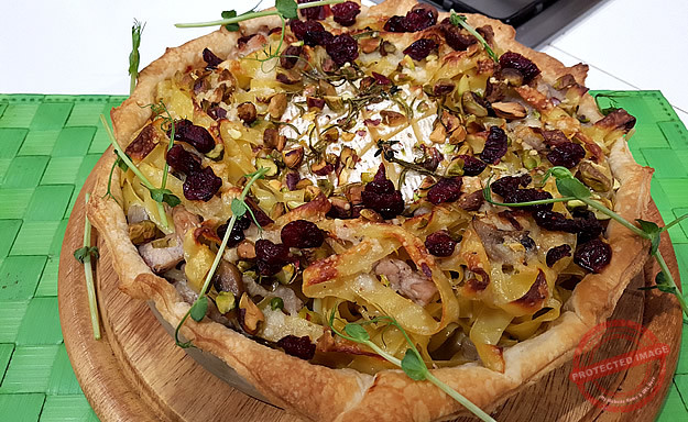 Grease an 8 inch flan ring with melted butter and line with thinly rolled puff pastry. Brush with the cranberry sauce. Start preparing pasta sauce. Cut the turkey breast into fine strips, peel wash and slice the leek, slice the mushrooms and the bacon. Fry together in a spoon of butter until starting to brown, season with salt and pepper, splash with the white wine, allow evaporation. Pour in the cream and reduce. Boil the pasta in boiling salted water. Drain and toss in the sauce, sprinkle with parsley, Parmesan and pistachios, take off the heat. Pour the pasta into the puff pastry case, push towards the edge making a hole in the centre. With the aid of a sharp knife, cut criss-cross cuts into the skin of the Brie cheese. Press in the centre of the pasta ring. Push garlic slivers and herb twigs into the cheese. Drizzle lightly with olive oil. Bake in a moderately hot oven at 175`c for approximately 20 minutes.