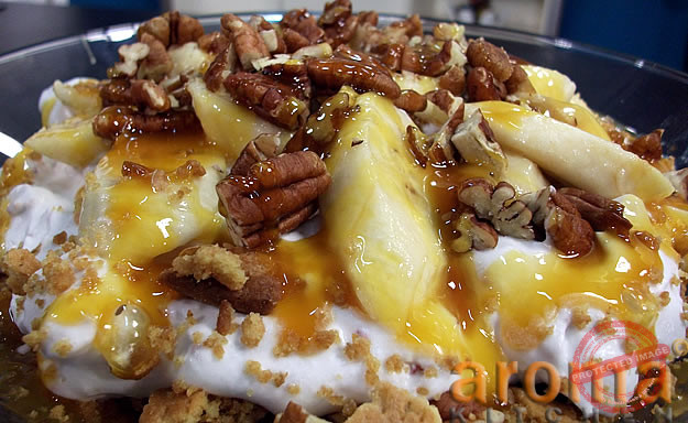 Start this recipe by whipping the cream to stiff peaks. Add the broken up meringues and pecan nuts and mix well. Take a large trifle bowl, and drizzle some of the toffee sauce around the inside to make a nice design. Put ½ the cream mixture into the bottom of the bowl and even out with a palette knife. Scatter ½ of the broken digestive biscuits and pecan nuts on top. Next, arrange ½ of the banana slices on top of the biscuits and pecans. Squeeze ½ of the remaining toffee sauce on top. Repeat the whole process again using all the remaining ingredients, ending with a layer of biscuits, pecans and toffee sauce on the top. Serve the banoffie style Eaton mess immediately otherwise the meringues will melt. (Serves 8 )