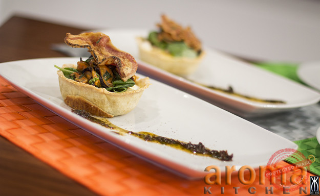 Basil and lime mussels and crispy pancetta on a spinach and feta quiche
