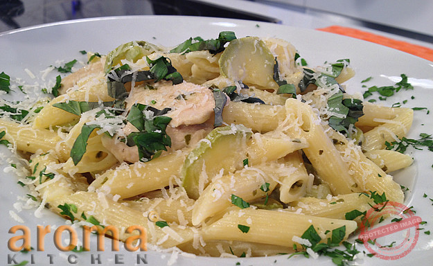Heat the butter substitute in a large heavy-based pan. Brown the chicken pieces, courgettes and garlic for about 5 minutes or until the chicken is cooked through. Stir through the basil pesto, lemon juice, lemon zest, cream and chicken stock pot. Bring to the boil, reduce heat and simmer for 5 minutes. Serve with penne and grated Parmesan.