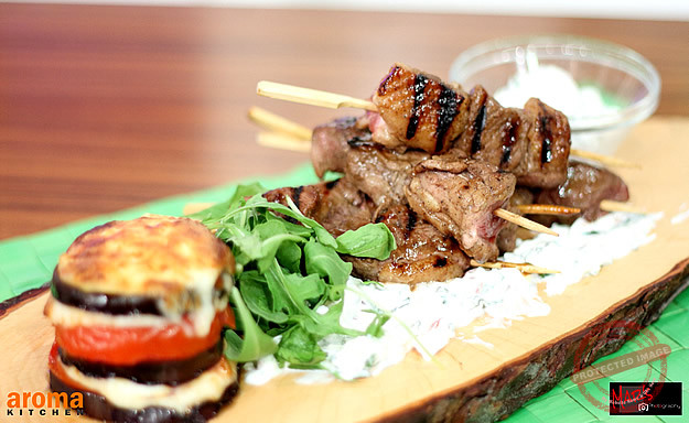 Beef and duck skewers on a grilled aubergine and tomato gratin
