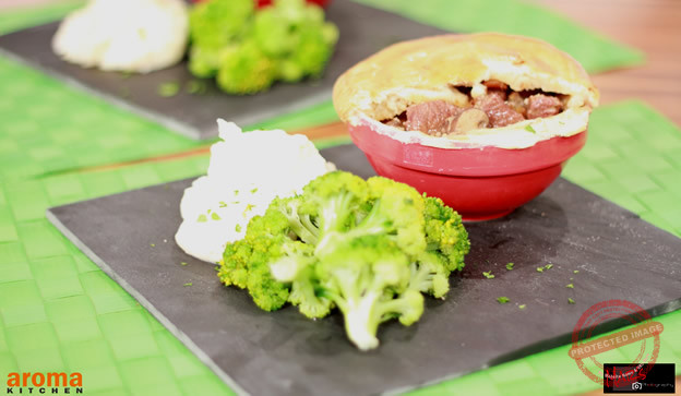 Start this recipe by placing the dried mushrooms and mushroom stock pot into a jug and pour over 400ml boiling water and put aside. Mix the flour with the beef cubes, season well with salt and pepper and brown all over in a pan with the oil in 2 batches for 2 minutes. Remove from pan, add in onions and bacon and fry to soften, then add in the carrots and cook for a further 2 minutes. Pop the meat back in, along with the beer, stock and soaked porcini mushrooms and the bunch of herbs. Bring to the boil, then place into the oven covered for 2 hours at 160`c. Add in the mushrooms in the last 30 minutes of cooking time. When ready, allow to get completely cold before making into a pie. Remove the tied herbs and discard. Grease a large or 4 small pudding tins with butter, spoon in the chilled beef mixture and cover with the prepared short crust pastry. Brush the tops with beaten egg and bake in the oven at 200`c for 40 minutes till golden brown. Allow to rest for 10 minutes before serving with the cooked broccoli and mashed potatoes.