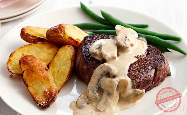 Preheat a frying pan with a dash of olive oil and quickly seal the fillet from both sides, adding butter to bask the fillet until golden brown. Allow to rest for 10 minutes, then continue to cook for 7 minutes in 180`c to have a medium grading. For the sauce, sauté the finely chopped onion and the mushrooms with a knob of butter till cooked, then add the red wine and reduce by half. Add the beef stock and reduce again. Finally add the soy sauce and serve.