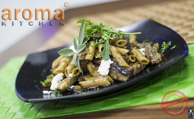 Start this recipe by heating 1 tablespoon of olive oil in a large pan and cook the sliced onions for 8-10 minutes to caramelize. Remove from the pan and put aside. In the same pan, heat the remaining oil and fry the chopped bacon till the edges are beginning to brown. Add in the chopped garlic and sage and cook for 2 minutes. Next, add in the beef fillet and cook for just a minute to seal. Add the sliced Portobello mushrooms to the pan, the beef stock pot and season well with black pepper. Cook for only a few minutes, making sure that the mushrooms and beef do not overcook. Add the 50g butter to the pan and allow to melt in before removing the pan off the heat. Meanwhile, cook the pasta according to the instructions on the packet and drain. Add the cooked pasta to the mushroom mixture and stir well, coating the pasta in all the juices in the pan. Immediately serve the pasta into deep bowls, crumble over the fresh ricotta cheese and garnish with fresh rucola leaves and a few toasted walnuts.