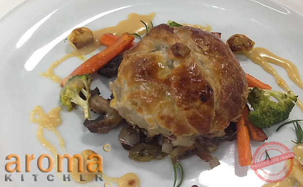 Preheat a pan and shallow fry the onions, garlic and mushrooms together with a knob of butter and cook till the mushroom softens. Remove off the heat and blitz for 3 seconds. In a separate pan seal the beef on all sides for 4 minutes, remove from heat and place on a tray. Spoon the mushroom mixture on top with the liver pate. Cover completely with the puff pastry like a parcel and bake for 8 minutes in oven till cooked through.