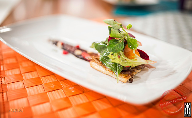 Slice the onion and sauté in butter with the sugar until caramelized, add the vinegar reduce and remove from heat. Use 2 round stainless steal cutters to cut the pastry than put the same cutters on an oven tray. Place the cooked onions divided in both cutters and than cover with the cut pastry. Remove cutter and brush the pastry with the egg yolk, bake until pastry is golden brown. once cooked remove from heat and use a wide slicer to turn the tart upside down. Peel, boil and dice the beetroot, quarter the mozzarella, chop the chilly and mix all in one bowl with the basil leaves and flaked almonds. Meanwhile cut the peaches in segments and place on an oven tray drizzle with honey and roast until golden brown, allow to cool and mix well with the rest of the salad. Serve the salad on the warm onion tart tatin.
