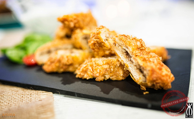Cut the foccacia lengthwise and spread with the bigilla, grate the goat cheese on the bigilla and close again with the top part of the bread. In a bowl Beat the egg and flour, meanwhile blend the cornflakes to mix with the breadcrumbs. Cut the focaccia in fingers and pass first in the egg mixture than into the bread crumbs and fry or grill. In a bowl mix well the yogurt, cucumber and mint to serve on the side as a dip.
