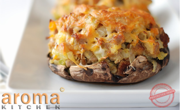 Blue cheese and bacon stuffed Portobello mushrooms with sage