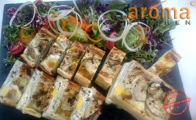 Grease one quiche tray with butter and layer with the pastry. trim off the edges to remove the extra pastry. layer the bottom of the tray with four whole eggs. season with salt and pepper. Crumble the blue cheese on top of the eggs, top the blue cheese with the sliced onions. Finally top with the artichokes and the other four whole eggs.season again with the salt and pepper. Bake at 150`c for 40 minutes. You can serve either hot or cold with a side salad.