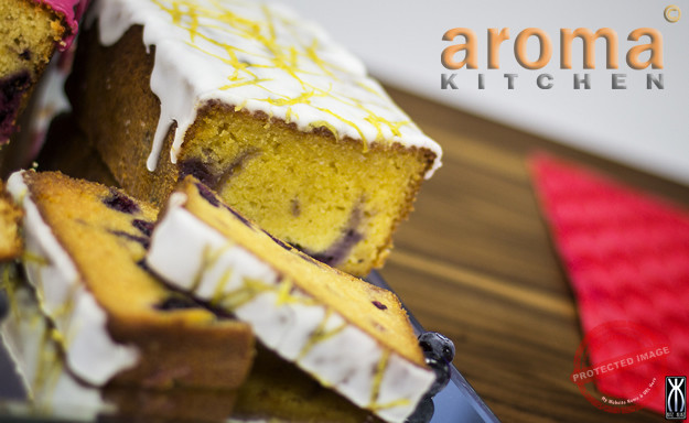 Blueberry and lemon curd loaf cake with glace` icing