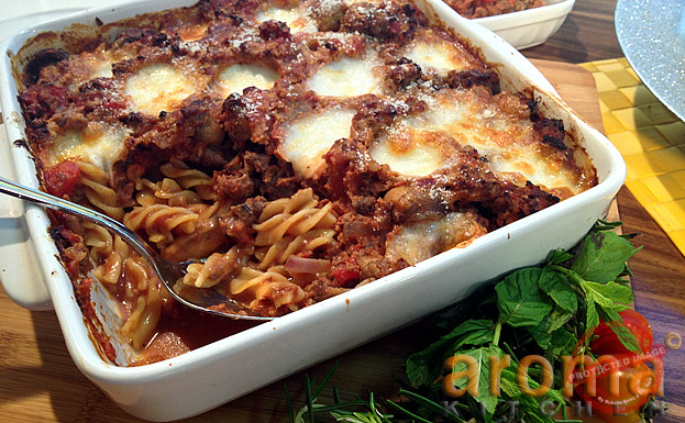 Bolognese `pasta bake` with mushrooms, mozzarella and Parmesan