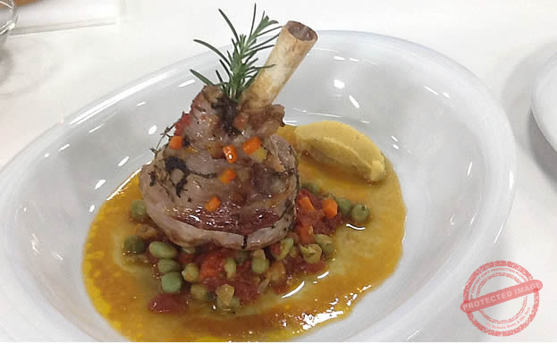 Preheat a deep, thick bottomed pan and seal the lamb from all sides. Place in a deep casserole dish and put aside. Meanwhile cook the carrots, onions and garlic in the same pan. Add the red wine and vegetable stock and reduce for 5 minutes. Pour over the lamb with the tomato sauce. Cook in oven for 40 minutes at 160`c, adding the peas in the last 3 minutes of the cooking time.