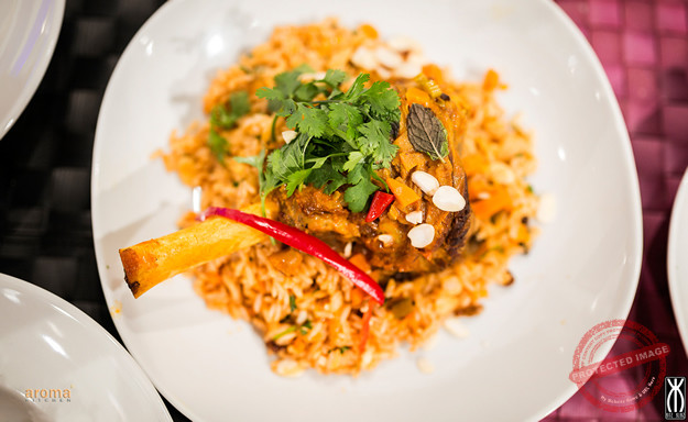 For the rice, cook the onion until soft and translucent in the butter, stir in the rice and spices, toast for a couple of minutes. Pour in the wine and allow evaporation. Pour in the remaining liquids, transfer into an oven proof dish , cover with foil and cook for approx. 18 minutes in a hot oven. When ready, fluff with a fork and stir in the almonds and raisins. For the lamb, seal the lamb shanks in hot oil, remove meat from the pot; add the vegetables, chilli and spices and cook until slightly browned. Return meat to the pot, add tomato paste and mix for further 2 minutes, Splash in the wine and allow evaporation. Stir in the tomato pulp and enough stock to cover the meat. Bring to the boil, set to simmer until meat is tender and almost falling off the bone.
