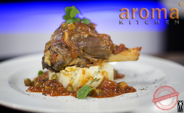 In a well heated pan seal well the lamb shanks, add diced onions, carrots, celery and garlic and cook until browned. Add the red wine and bring to the boil before pouring in the tomato pulp. Place in an oven tray cover and cook at 160`c for 1 ½ hours. Boil potatoes and mash roughly with butter and cream. Serve together in deep plates.