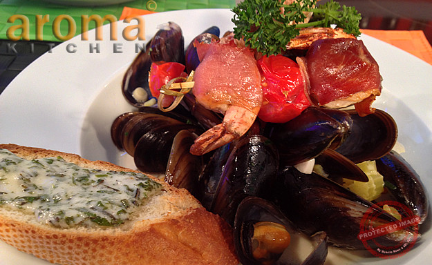 Braised mussel stew with grilled herbed crostina and prawn brochette