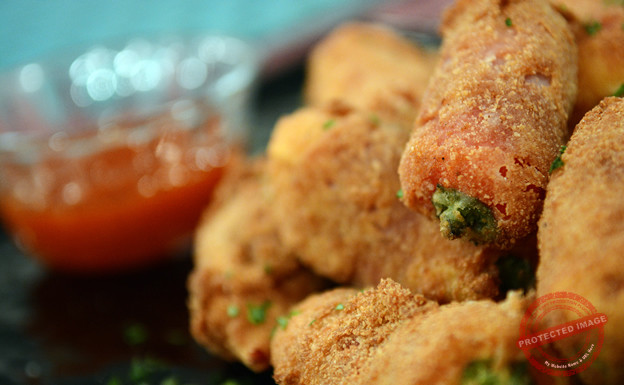 Start this recipe by blanching the peppers in hot water for 1 minute. Immediately place into cold water to cool. When cooled down, slit the middle of the peppers and stuff with mozzarella. Wrap each pepper up tightly in a slice of Parma ham and put aside. Place the vegetable oil on the heat to warm and meanwhile bread the peppers by dipping in the flour, then the beaten eggs, then finally into the seasoned bread crumbs. Fry in the hot oil till golden brown then serve on a wooden board with the sweet chilli sauce on the side.