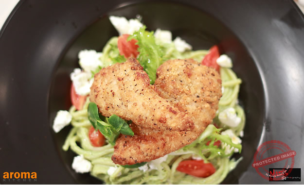 Breaded chicken fillets with avocado and feta cheese spaghetti salad