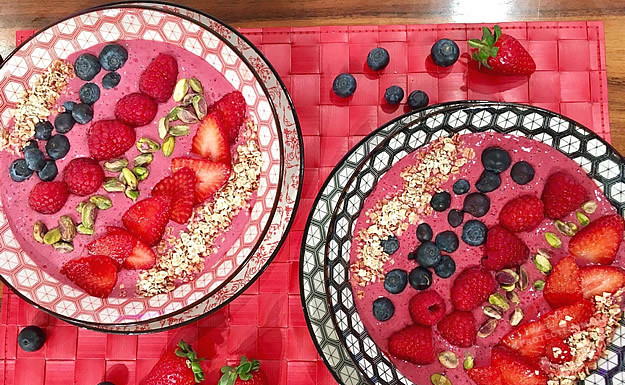 Start this recipe by placing the oats onto a baking tray and toast in the oven at 200`c for just 4-5 minutes. Remove and allow to cool down. Meanwhile, Blitz all the remaining ingredients together and pour into fancy jugs or cereal bowls. Decorate the tops with the toasted oats and fresh berries.