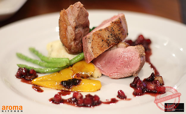 Breast of duck, lime and thyme mash and pomegranate reduction