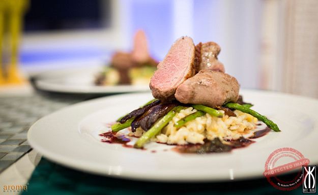 Breast of duck on a mango and almond risotto with thyme butter