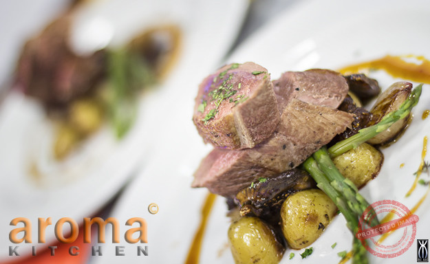 Remove any extra duck fat and pan fry on a high heat, fat side first. Remove duck from the pan add honey, caramelize and pour in the juice, simmer until thickened. Roast the duck at 180`c for approximately 9 minutes than allow 2 minutes to rest. Boil lightly the potatoes cut in half than toss in chopped pancetta crushed whole peppercorns and roast. Cut the shallots in quarters and sauté in butter with chopped chilly and spring onions until softened add the fig cut in half, toss for 3 minutes than finish with Marsala and simmer. Blanch the asparagus, toss in butter with salt and pepper and serve together.