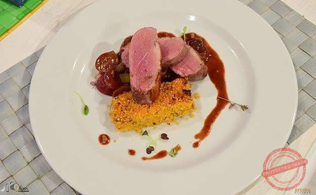 Breast of duck with a grape and apricot compote, walnut couscous cake