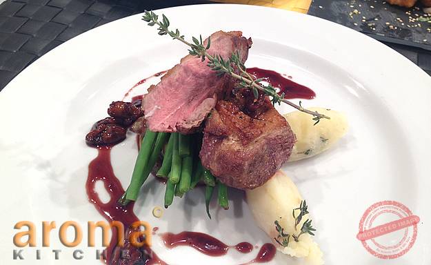 Clean the extra duck fat and pan fry fat side first, remove form pan and place in an oven tray to finish in oven at 180`c. Core the apple and slice it sideways .5cm thick, shallow fry in same duck pan adding sugar, walnuts and syrup. Once caramelized add red wine and reduce. Trim the French bean blanch and toss in salted butter. Cut the potatoes in cubes, boil and crush with the fresh thyme and butter, season and serve on the side with the compote underneath the sliced duck breast.