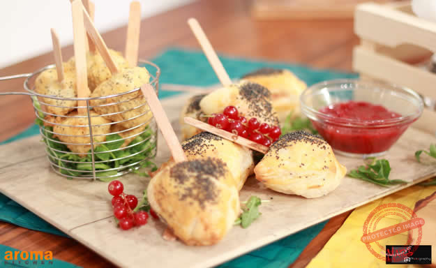 Hold the Brie cheese flat with the palm of your hands and split horizontally. Brush with the cranberry sauce and sandwich back together, cut into 6 wedges. Roll the puff pastry into a long strip, double the width of the cheese bites. Brush with the mustard and put the Brie on top, fold over the pastry and press the edges to secure the edges. Push an ice cream stick into the thick part of the wedges and chill, allowing pastry to rest. Brush with beaten egg and sprinkle with poppy seeds. Bake in a hot oven until pastry is golden and crispy.