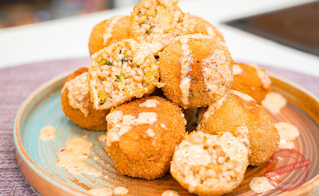 Sauté the leek and garlic in butter and olive oil until softened and season with salt and pepper while cooking. Add in the rice, bay leaves and stir well, then pour in the wine, bring to the boil for 1 minute. Slowly add in the stock and broccoli and mix together well. Remove off the heat and leave the risotto in the fridge to set. Form into small arancini balls and freeze. Meanwhile whisk the egg and season the flour. Dip the arancini balls in, place immediately in the breadcrumbs. Roll and deep fry immediately in hot oil. Sauté the ginger in a small pan, add in the cream and bring to the boil. Mix in the Mexican cheese to melt and use as a dip with the fried arancini.