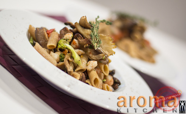 Peel the prawns and dice, slice the mushrooms, cut the broccoli in small florets, chop the garlic and quarter the tomatoes. Place all the ingredients in a small oven tray drizzle with olive oil and grill in the oven until browned. Meanwhile boil the pasta and toss with the other ingredients once roasted.