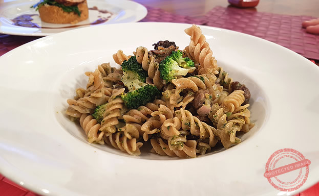 Għaġin ismar bil-bebbux, bi derssing tas-sagħtar, asparaġi u żebbuġ
