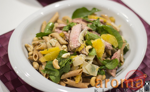 On a griddle pan grill the steak to medium and place on a chopping board, cut in thin slices and mix with the cooked pasta, add the rocket leaves, crushed almonds, orange segments, parmesan shavings and drizzle with garlic oil.