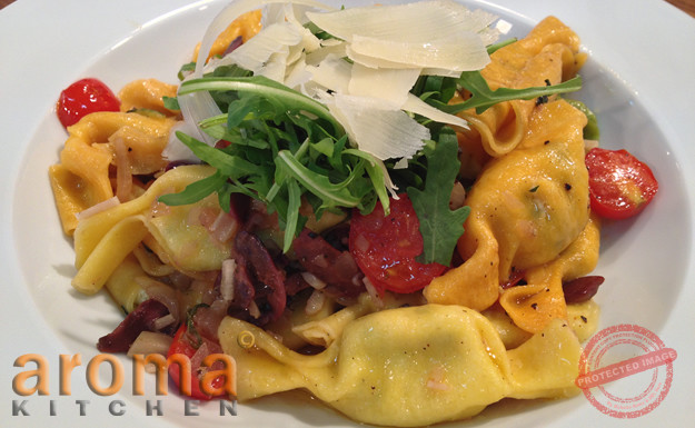 Carameli shaped pasta filled with ricotta and spinach, aglio e olio style