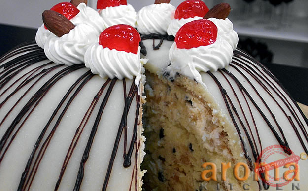 Whip the cream till stiff and put to one side. To make the ricotta filling, mix together the ricotta, candied peel, chocolate chips, hazelnuts, caster sugar, vanilla essence and orange zest in a bowl, and then fold in1/2 of the whipped cream. The remaining whipped cream will be used to decorate the finished cassata. Put the ricotta filling in the fridge to chill while you prepare the sponge. Slice the 3 sponges into thin slices. Use some of the sliced sponge to line the pudding bowl completely. Spread 1/3 of the ricotta filling into the base of the pudding bowl which is lined with the sponge. This will form the first layer. Spread out, and then cover the ricotta filling with a layer of the sliced sponge. Spread ½ of the remaining ricotta filling on top, spread out and then cover with another layer of sliced sponge. Add the remaining ricotta, and spread out. Cover the top with the remaining sliced sponge so that the bowl is filled to the top. You should now have 3 layers of ricotta filling. Place the filled pudding basin in the fridge and chill for 1 hour for the ricotta to firm up. Now all that is left to do is decorate the cassata. Take the chilled cassata out of the fridge and tip it out on to your serving plate. Put the apricot jam into a small saucepan and heat till soft. Brush the warm apricot jam all over the outer sponge layer as this will help stick the marzipan to the cassata. Dust a work surface with icing sugar, and roll out the marzipan to a large circle, and place on top of the cassatella, covering completely. Use your hands to smooth out the marzipan, and then cut off any excess. Put the remaining whipped cream in a piping bag fitted with a star nozzle, and pipe shells around the bottom of the cassata. Finish off the cassata Siciliana with some glace` cherries and toasted almonds.