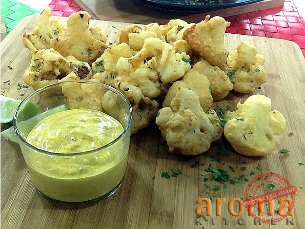 For the cauliflower fritters, bring a pan of water to the boil. Add the cauliflower florets and boil for 3-4 minutes, or until just tender. Drain well, then refresh in cold water and drain again. Set aside. In a bowl, beat the egg and milk together. Add the salt and flour and beat until the mixture forms a smooth batter. Heat the vegetable oil in a deep, heavy-based pan so that it reaches two-thirds of the way up the pan and heat until a breadcrumb sizzles and turns brown when dropped into it. Dip the drained cauliflower florets into the batter, then carefully lower them into the hot oil, in batches if necessary. Deep fry for 3-4 minutes, or until crisp and golden-brown, then carefully remove them from the oil using a slotted spoon and set aside to drain on kitchen paper. Repeat the process with any remaining cauliflower florets. For the curried mayonnaise, mix the mayonnaise and curry paste together in a small bowl until well combined. To serve, place the curried mayonnaise into a deep bowl and place on a large serving dish. Arrange the cauliflower fritters around the curried mayonnaise. Sprinkle over the chopped coriander leaves and serve.
